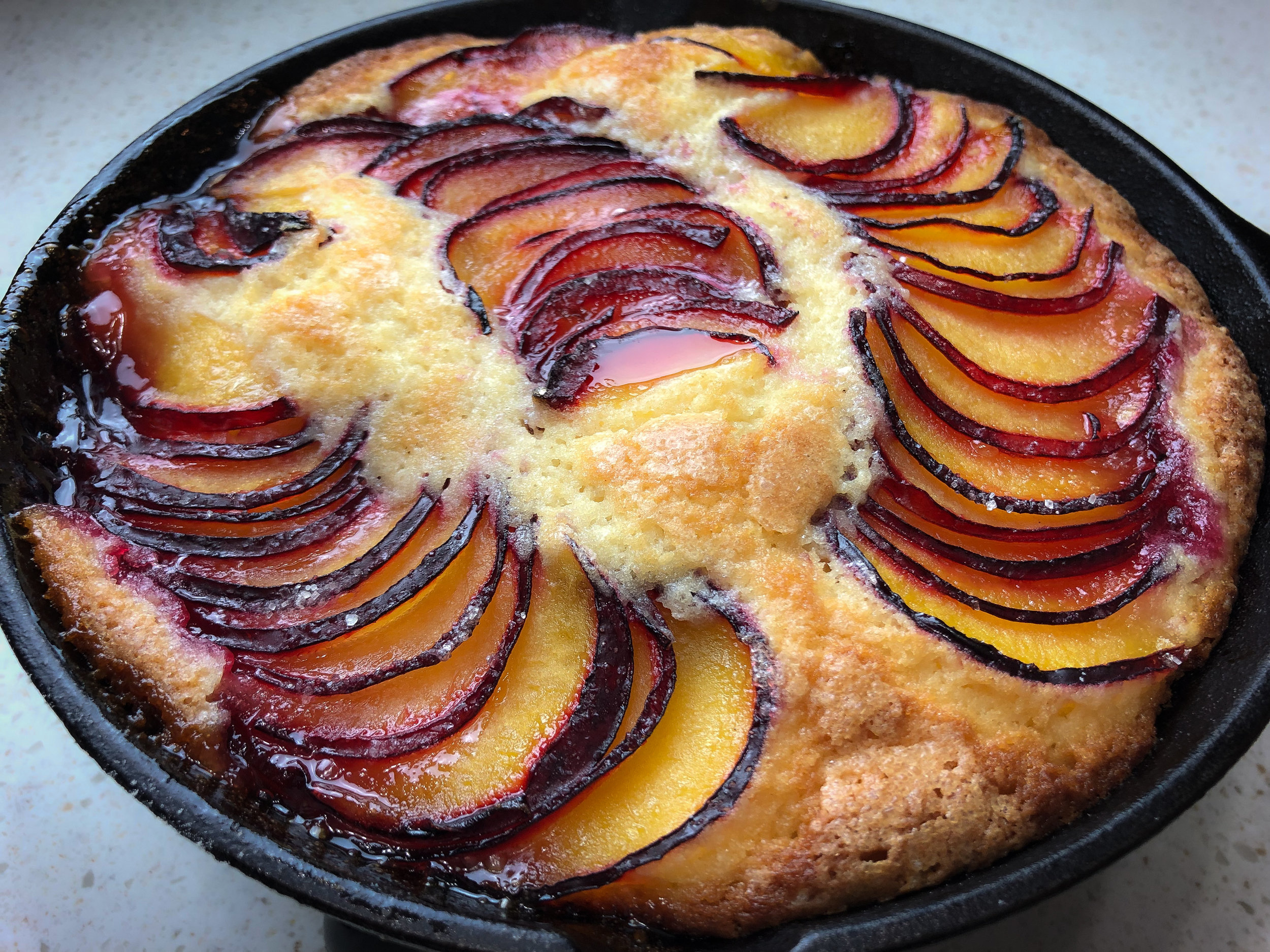 3. Pour batter over fruit and smooth top. Bake until cake is deep golden brown and a toothpick inserted in center comes out clean, 35 to 40 minutes, rotating halfway through. Let cake cool in skillet on a wire rack 5 minutes. Run a knife around edge and carefully invert cake onto a serving plate. Serve warm or at room temperature.