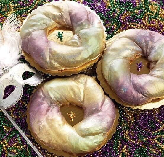 You’ll find two basic styles of king cake : one, french king cake; galette des Rois made of pâte feuilletée, puff pastry and filled with a creamy almond paste called frangipane. The other, more traditional to us in SWLA is a brioche-style enjoyed with the traditional filling of cinnamon and sweetened cream cheese or customized filling of lemon, cherry, pecan praline, or strawberries & cream; whatever you like!