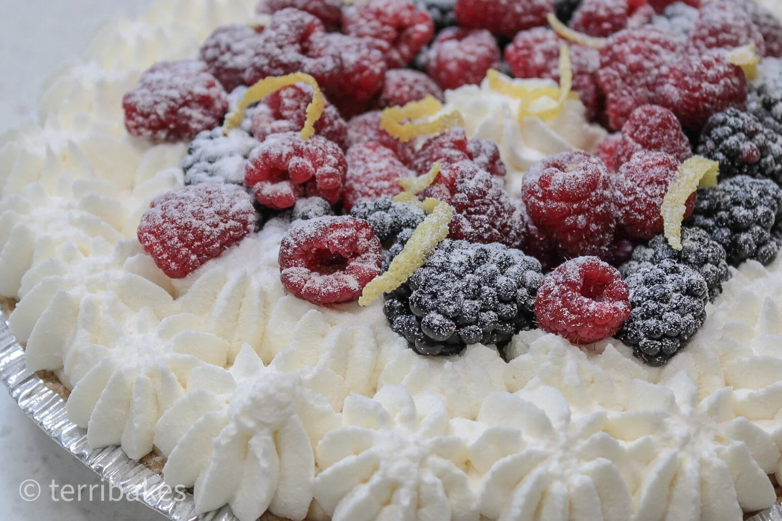 Top with blackberries, raspberries and mint leaves or lemon curls or twists. I arranged the berries around the top of the pie and dusted them with powdered sugar to give it a little finishing touch and it made the berries look frozen.