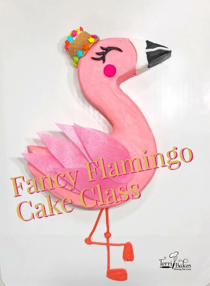 CLASS DESCRIPTION: In this class, you will learn to use a template to cut a cake in the shape of a Flamingo, use edible decorations and create edible feathers from wafer paper and make a fancy hat for your Flamingo.