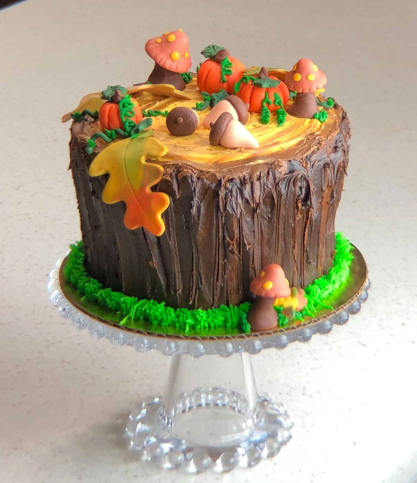 CLASS DESCRIPTION: In this class you will learn the techniques to create pumpkins, acorns, mushrooms and leaves in fall colors on a tree trunk cake.