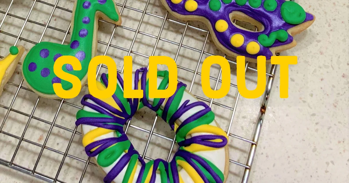 You will have 6 large cookies to decorate; t-shirt with beads, king cake, fleur-de-lis, music note, crown, and mask.