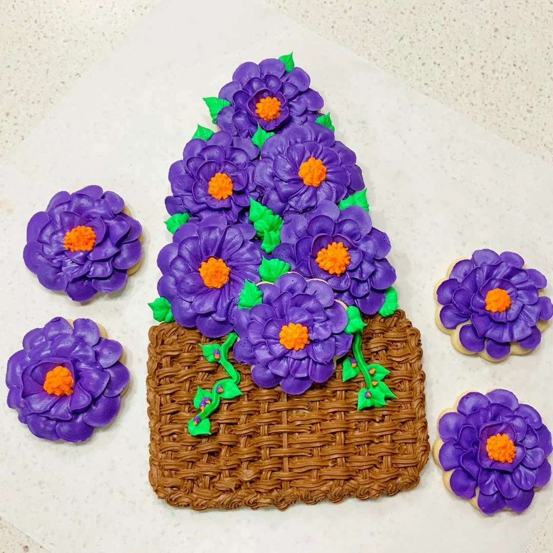 You will learn techniques to create 6 buttercream flowers, a basket weave base and how to pipe leaves, vines and mini blooms. Your finished cookies will be arranged on a edible cookie plaque to form a beautiful blooming flower basket.